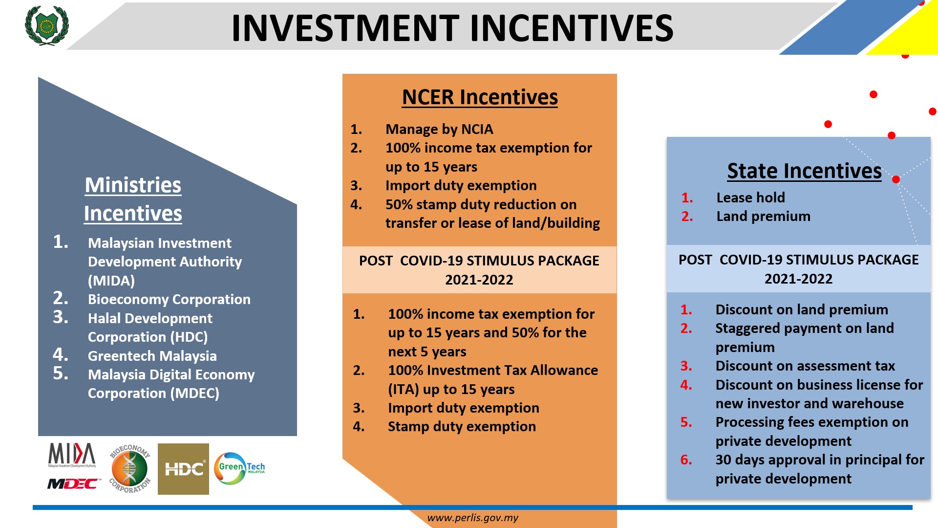 **All incentives offered by MIDA applies in Perlis. For more information on the incentives offered by MIDA, feel free to visit MIDA’s Incentives Information Portal here.