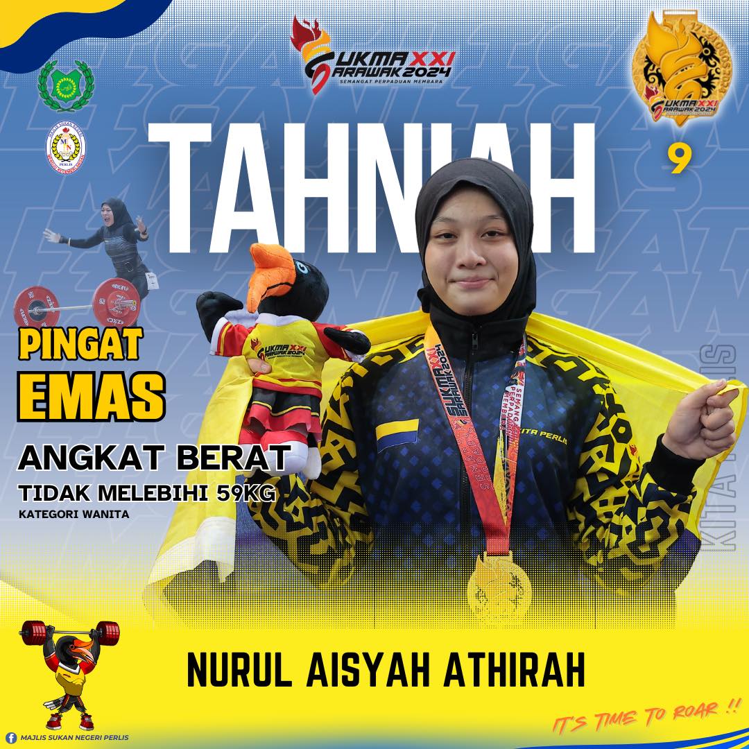 Alhamdulillah Emas lagi dirangkul oleh atlet wanita angkat berat Perlis, Nurul Aisyah Athirah bagi kategori tidak melebihi 59kg. Badang wanita Perlis ini menghadiahkan pingat Emas yang ke-9 setelah berjaya dengan angkatan Snatch (75kg) dan Clean & Jerk (95kg) sekaligus mengumpul jumlah angkatan tertinggi dengan keseluruhan 170kg !
