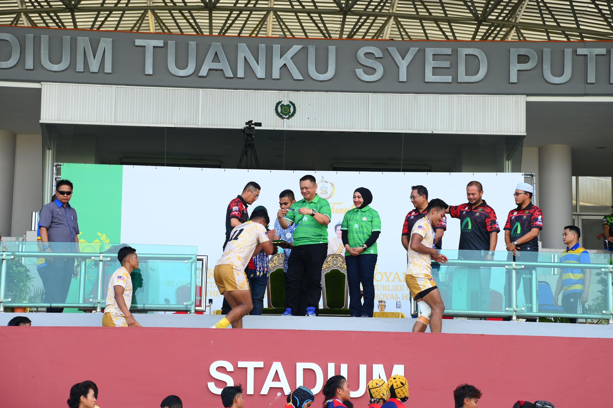 DYTM Raja Muda Perlis Tuanku Syed Faizuddin Putra Ibni Tuanku Syed Sirajuddin Jamalullail bersama DYTM Raja Puan Muda Perlis Tuanku Dr. Hajah Lailatul Shahreen Akashah Khalil telah berkenan berangkat ke Majlis Penutup dan Pengurniaan Hadiah Sempena Kejohanan Ragbi Takaful Ikhlas Perlis Royal Seven 2025 bersempena Sambutan Jubli Perak Pemerintahan dan Sambutan Ulang Tahun Keputeraan Ke-82 DYMM Tuanku Raja Perlis.